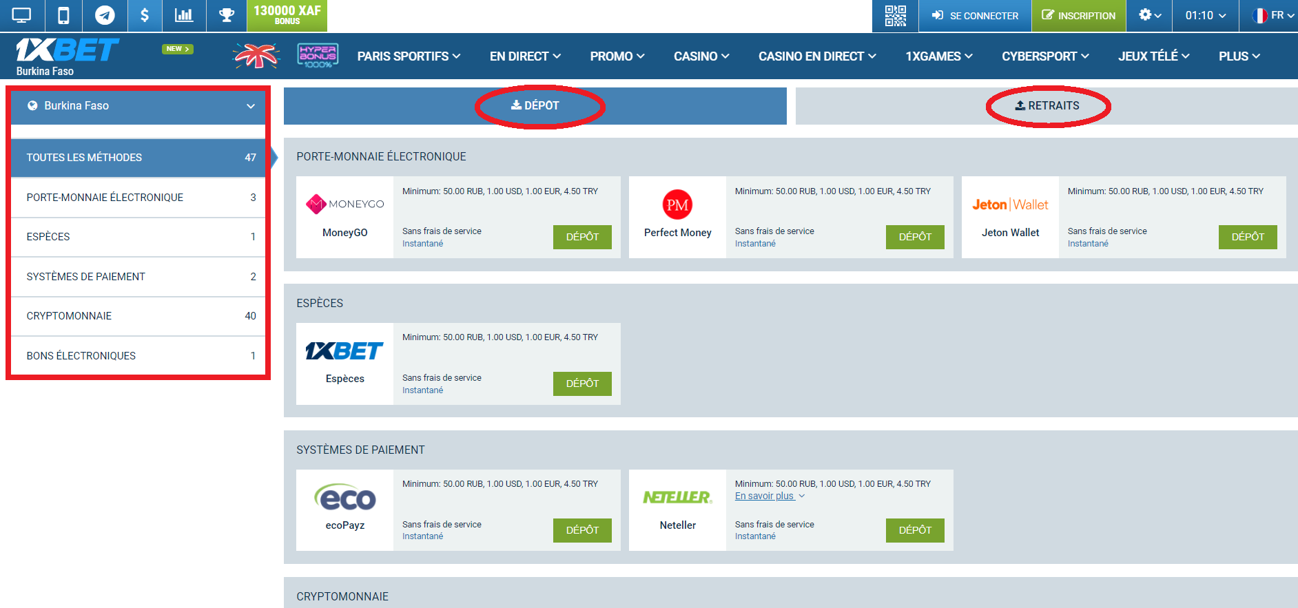 Méthodes de paiement : Dépôts et retraits 1xBet
